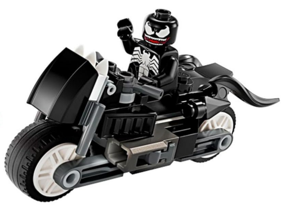 The Venom Street Bike (30679) LEGO® set is a buildable motorcycle toy measuring over 4 in. (10 cm) long which comes with a Venom minifigure. The powerful-looking motorcycle features rolling wheels and 2 stud shooters. The motorcycle is mostly black or dark gray with a white accent piece as part of the front fender and white wheel hubs. Two pointy, curved black tendrils stick out from the rear end of the motorcycle.